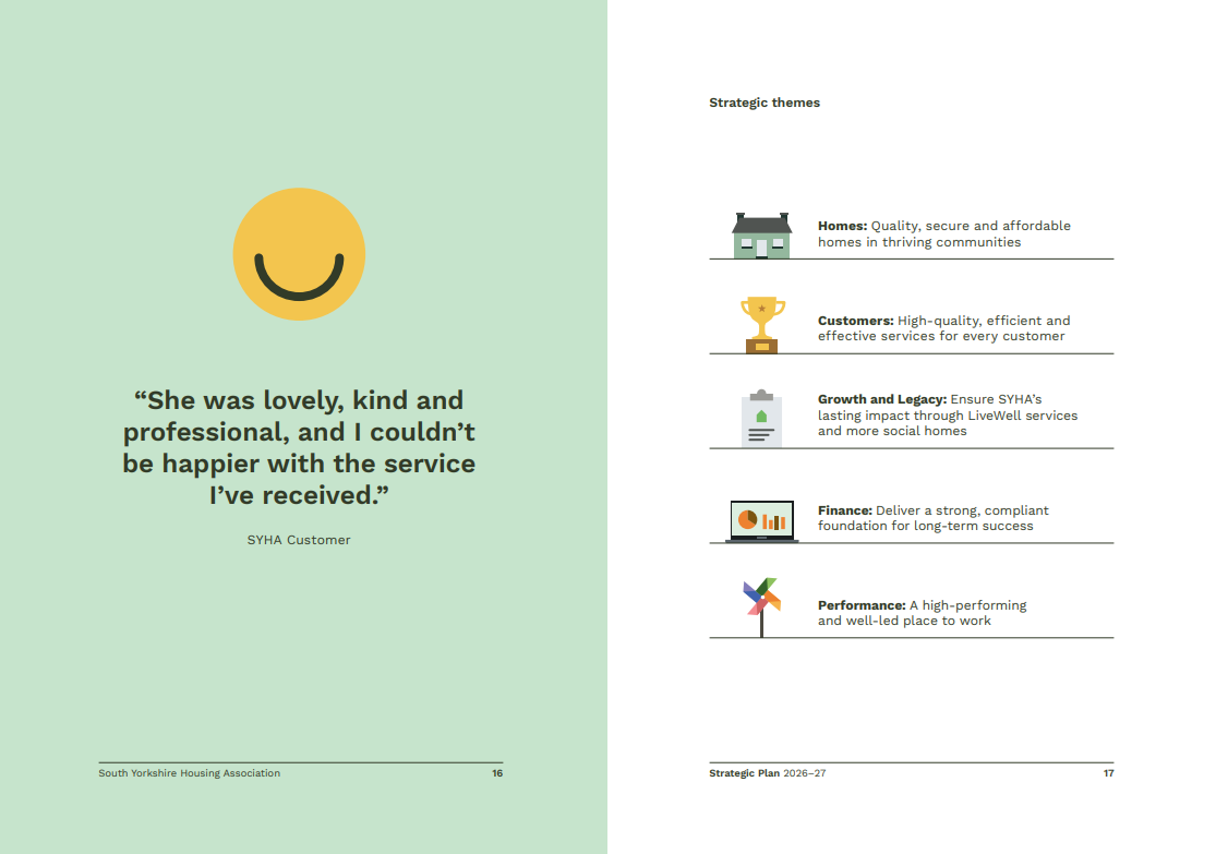Our five strategic themes are now Homes, Customers, Performance, Finance and Growth and Legacy, and they describe how we’ll continue to fulfil our vision for our customers, colleagues and the region.