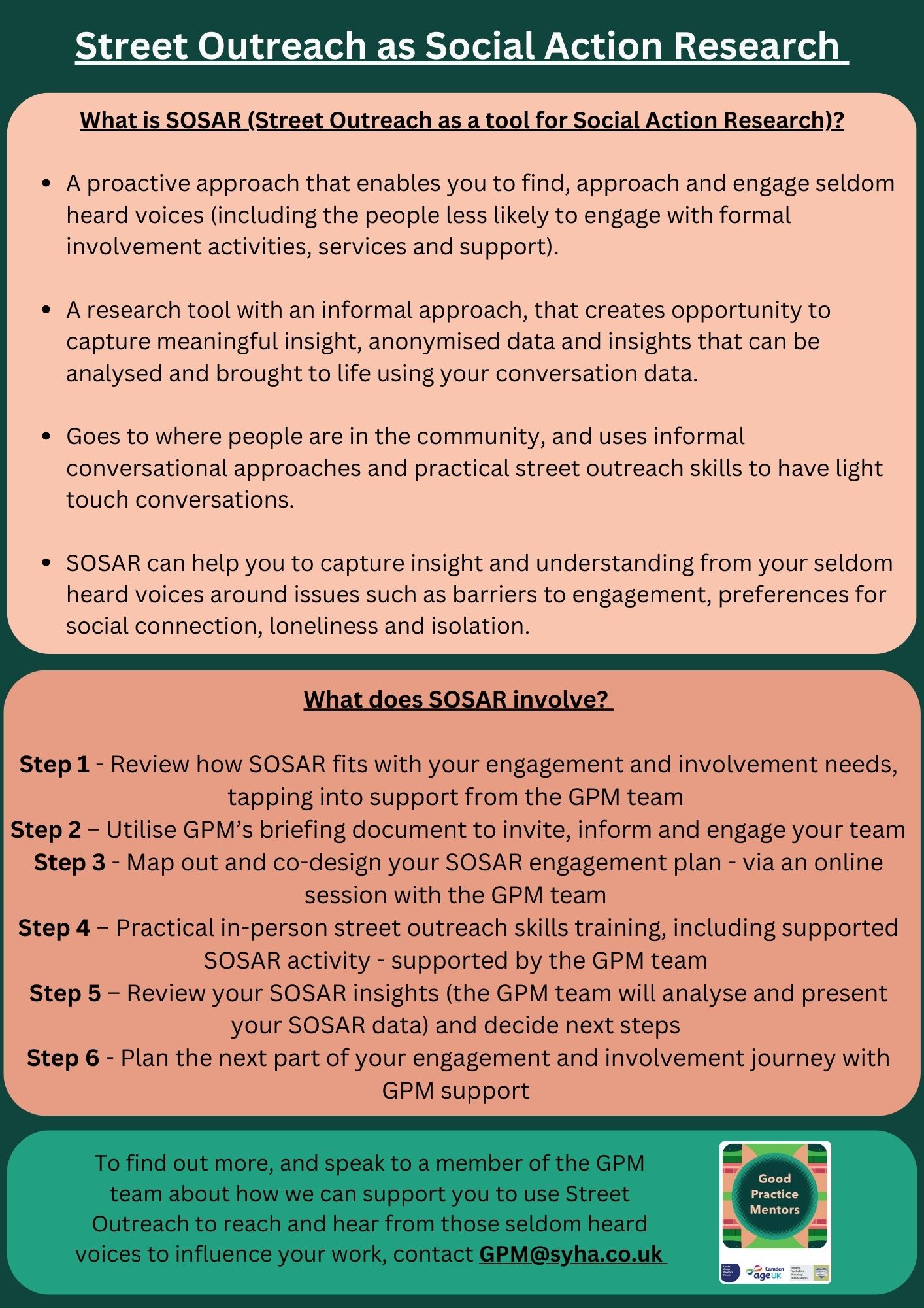 We offer support for organisations to increase their engagement with local communities. We can work with you to make improvements and changes to your services, learn more about co-production, and to reach more people in your community. Find out more about the Good Practice Mentors and meet the team.